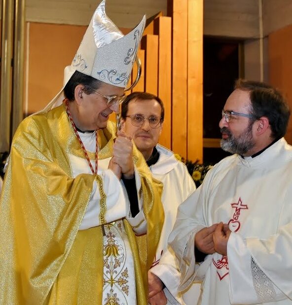 Don Paolo Pizzuti (parroco di Santa Monica - a destra) con il Cardinale mons. Paolo Augusto Lojudice (oggi Arcivescovo di Siena-Colle di Val d’Elsa-Montalcino e Vescovo di Montepulciano-Chiusi-Pienza) - si ringrazia per le immagini e i video @Carla dell'Aversana)